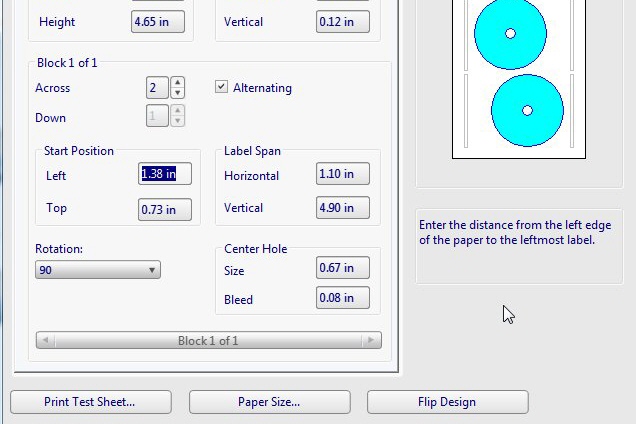 You can customize any of the template, or “printing” values, in here. These are the numbers that tell the printer where to print. If you’re unsure what one of these values corresponds to, simply place your mouse cursor in the respective field box, and read the description below the Preview on the right.This is a sheet break down that might help as well.