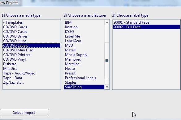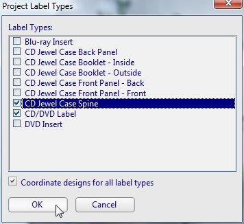 Then click the Project Label Types commandChoose the label types you want, such as CD Jewel Case Back Panel or DVD Insert, on the Project Label Types dialog box.